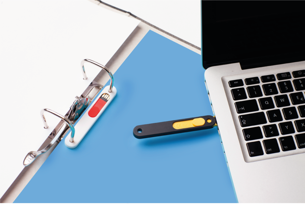 Abheftbare USB-Sticks lassen sich ganz einfach wie reguläre USB-Sticks handhaben. Sie speichern wie üblich über “Speichern unter” oder per Drag & Drop. Es gibt nichts spezielles zu beachten. Der Clou kommt durch die dem normalen USB-Stick zugefügte Abheftbarkeit. So wird aus einem einfachen USB ein USB, den man mit Papier und Ordnern verbinden und wiederfinden kann. Ein Griff und alles ist da!